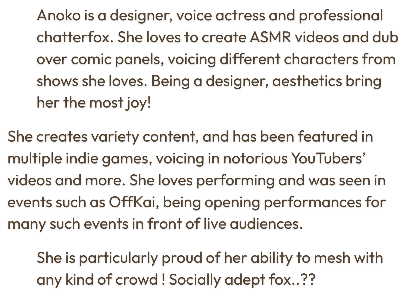She creates variety content, and has been featured in multiple indie games, YouTube videos and more. She loves performing and was seen in events such as OffKai, singing in front of live audiences.