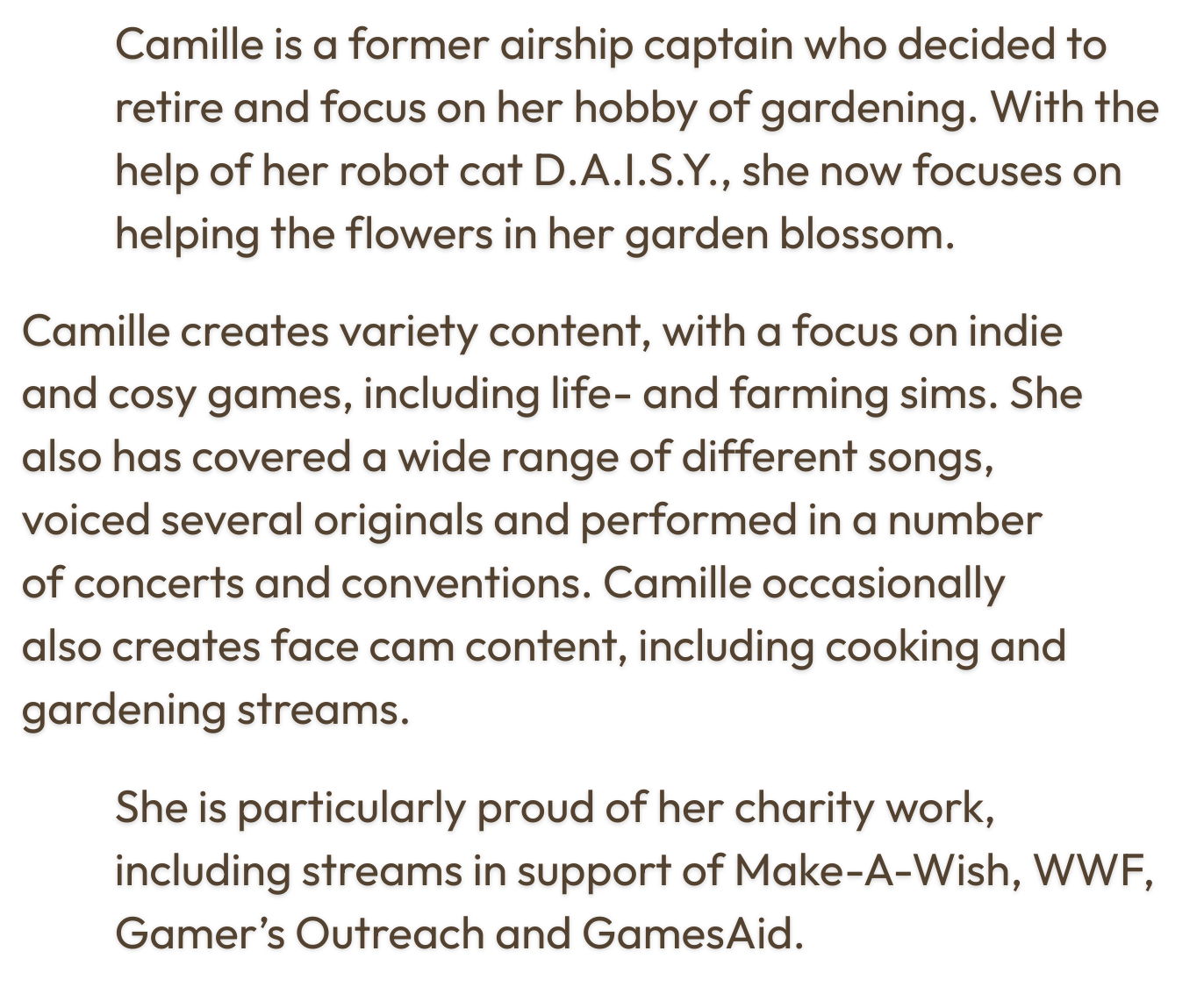 Camille creates variety content, with a focus on indie and cosy games, including life- and farming sims. She also has covered a wide range of different songs, voiced several originals and performed in a number of concerts and conventions. Camille occasionally also creates face cam content, including cooking and gardening streams.