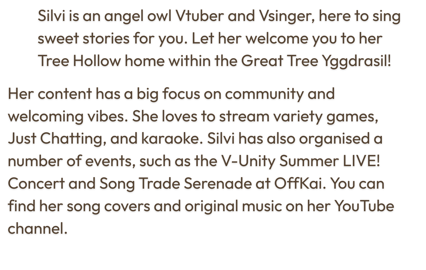 Silvi is an angel owl Vtuber and Vsinger, here to sing sweet stories for you. Let her welcome you to her Tree Hollow home within the Great Tree Yggdrasil!